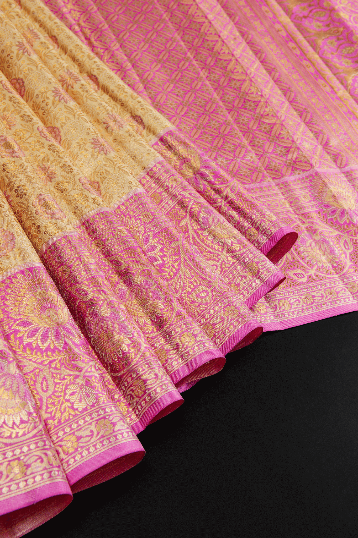 The border features contrast gold zari pink border and pallu. Contrast Gold Zari Pallu Blouse: Contrast Pink Blouse