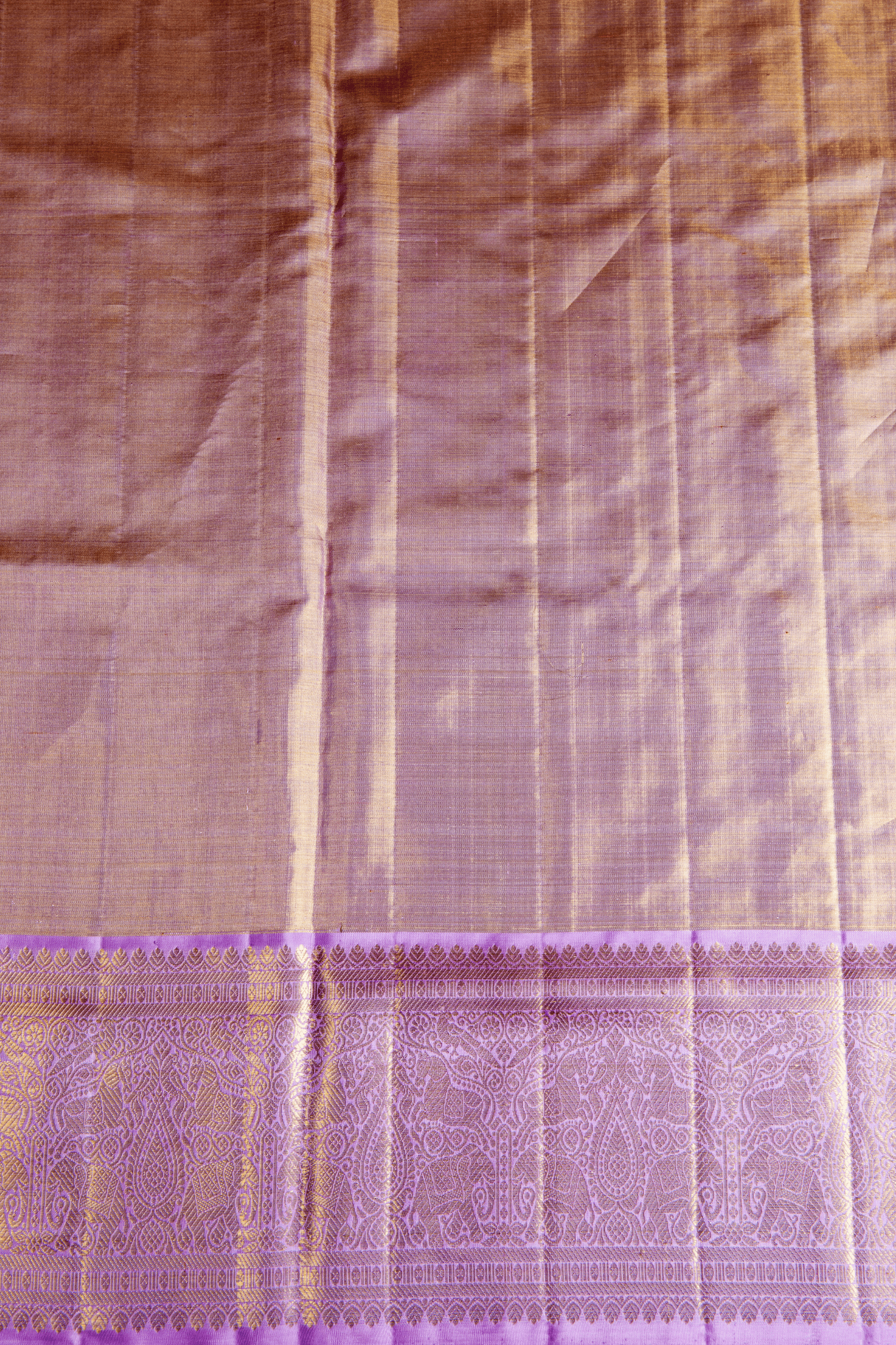 The border in the saree is adorned with a gold zari brocade contrast lavender medium border, enriched with elephants peacock and horse motifs in florals,