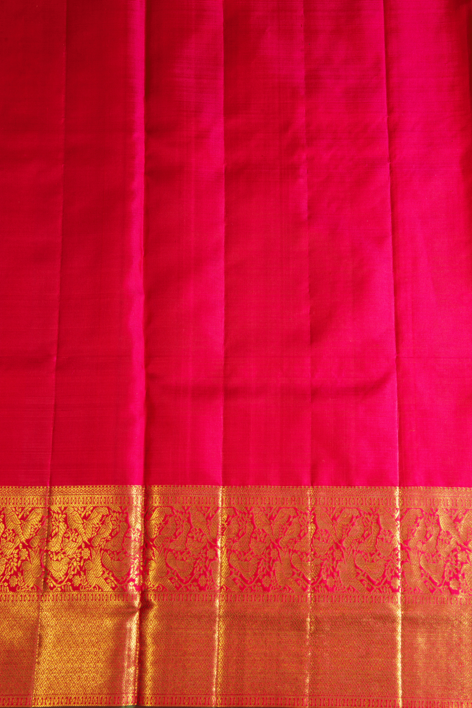 The pallu is a self tambulam design which gives a traditional appeal. A self-pink blouse is a perfect choice!