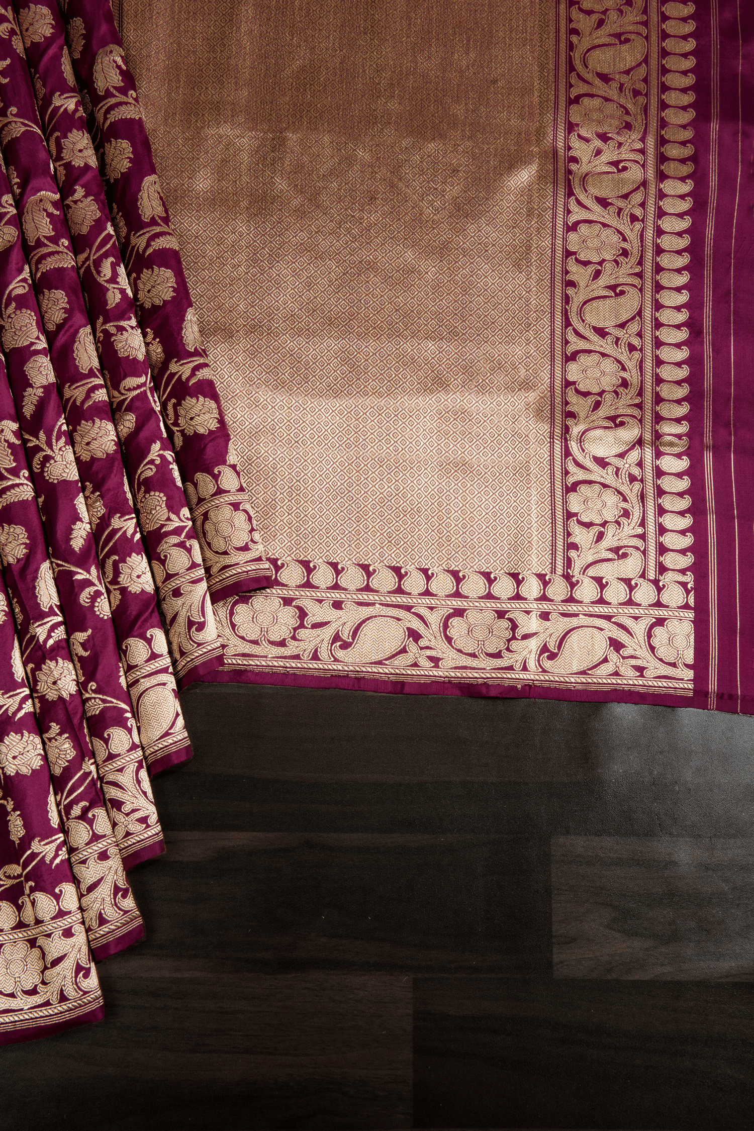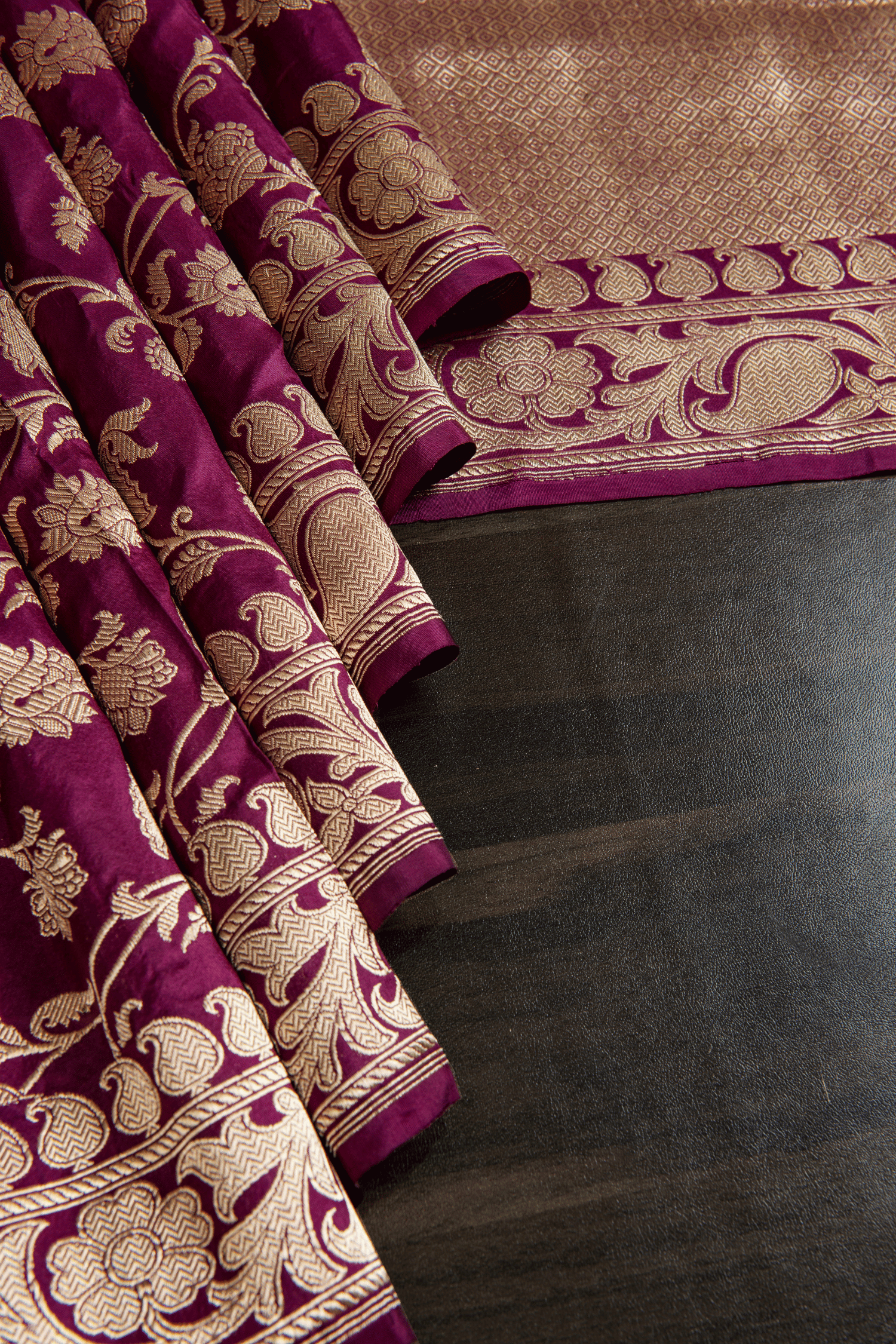 floral vines and floral motifs and a rich pallu, a self blouse with zari floral border.