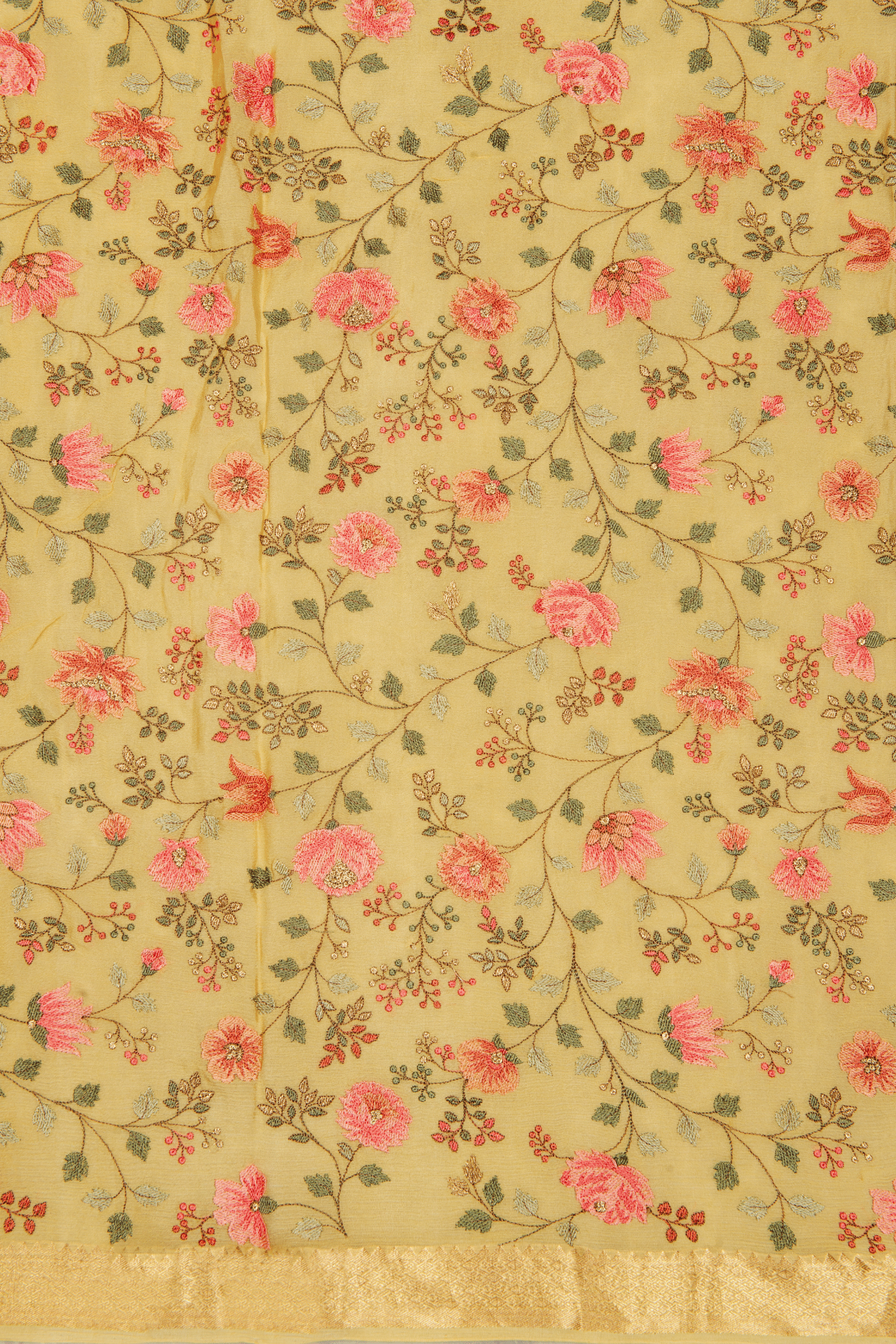 The pallu complements the body with its self-colored design, framed by a zari border that runs along its edges, adding an element of sophistication. The blouse is self-colored, beautifully crafted with all-over floral embroidery, perfectly matching the saree's elegance.