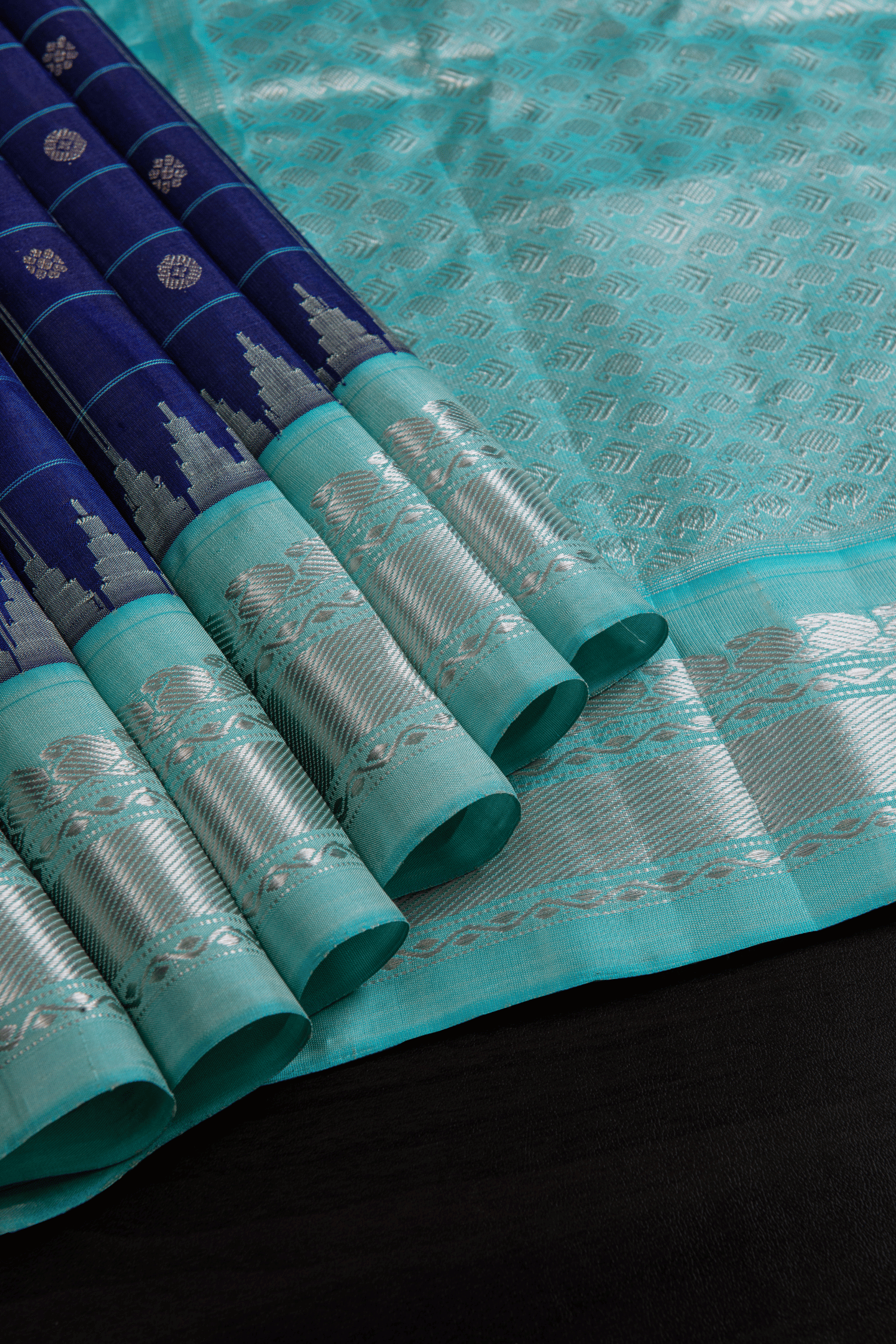 This saree features beautiful checks in sky blue thread, adorned with peacock and chakra motifs.