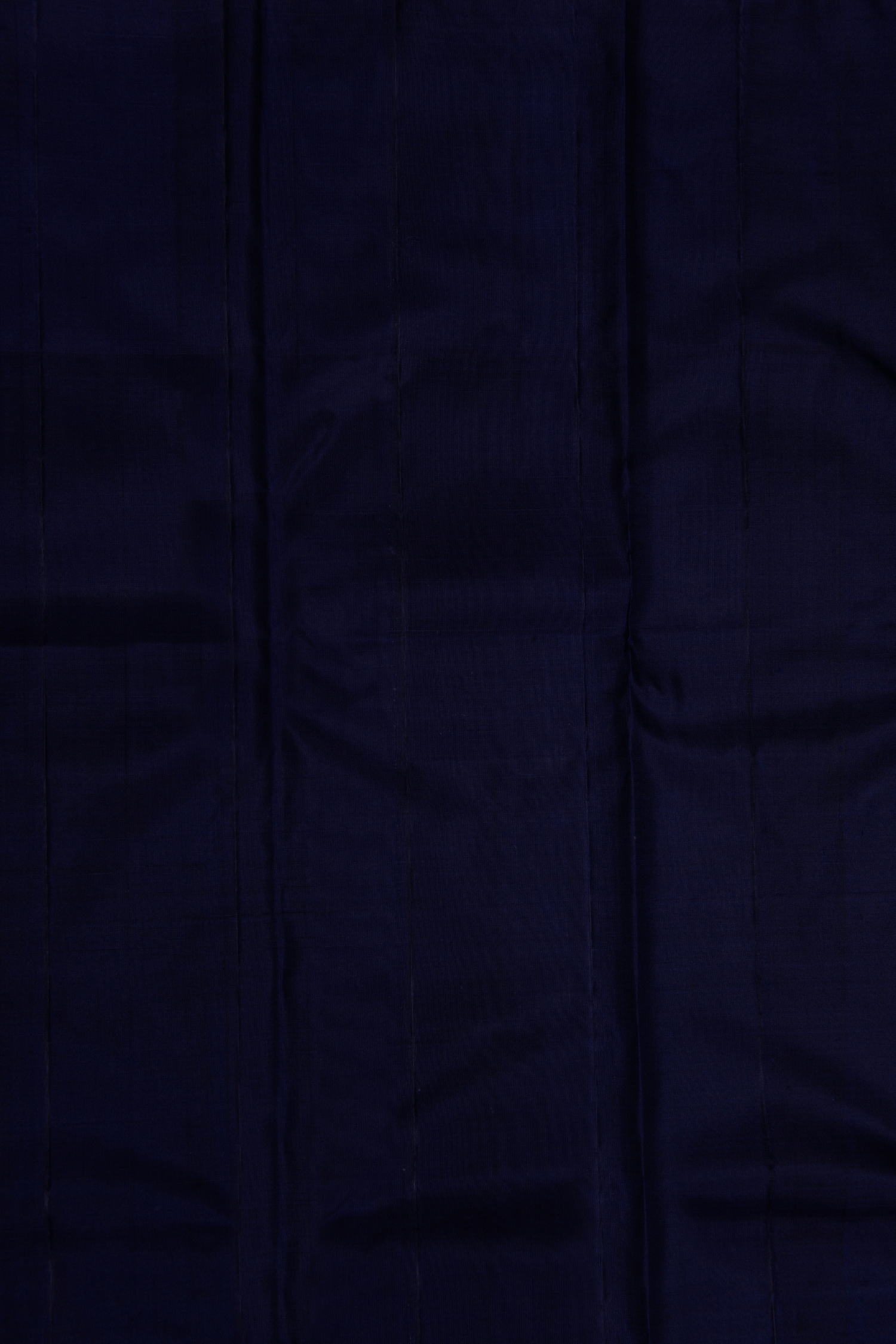 This stunning Kanchipuram pure silk saree features a deep navy blue body adorned with delicate golden motifs,
