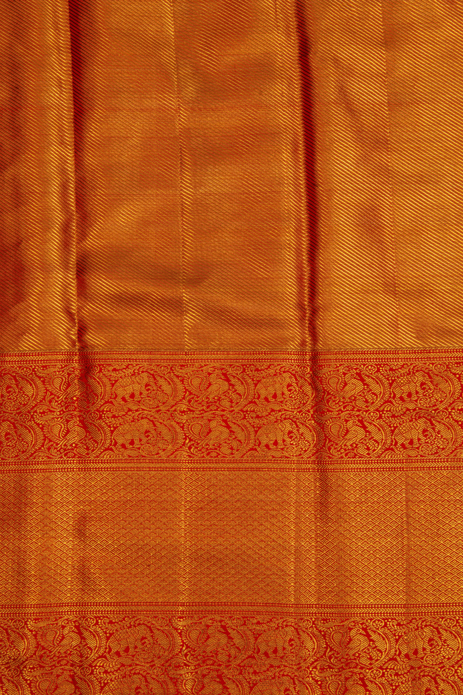 This luxurious Kanchipuram Pure Silk Saree in glowing golden orange is adorned with rich zari weaving that radiates regal splendor.