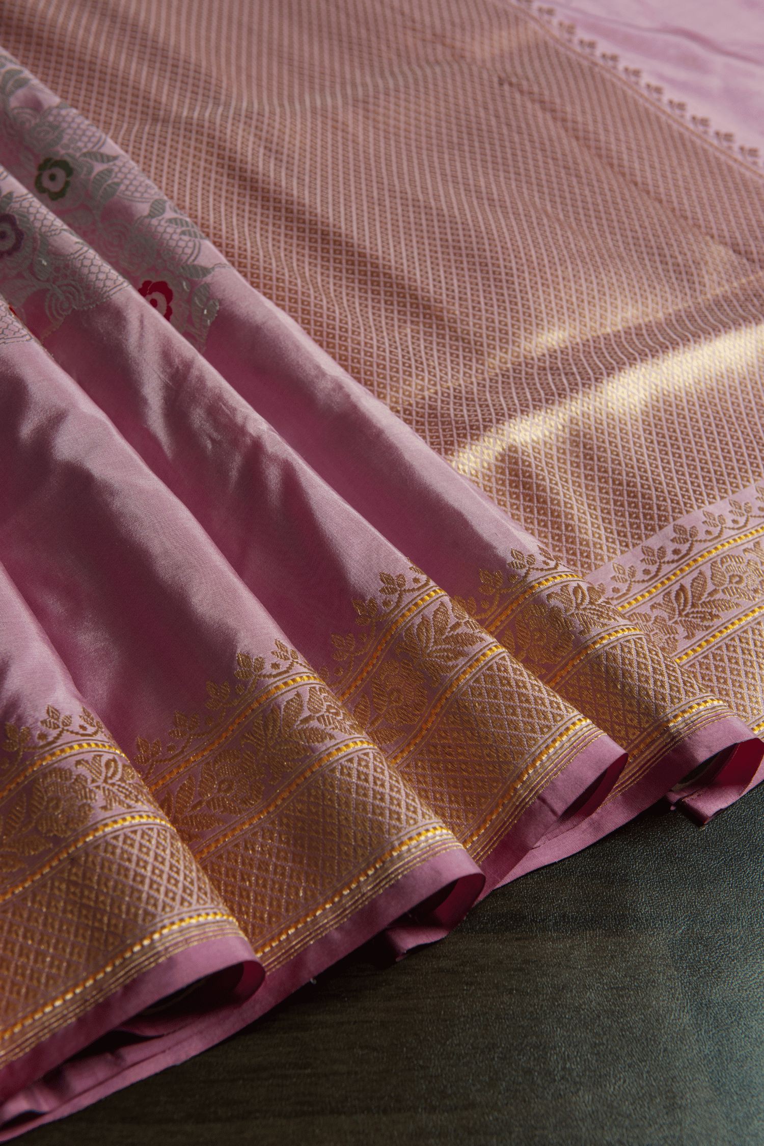 Flaunt with our banarasi lavender shade saree with silver intricate floral zari with meena butti allover the body, A enriched gold zari border with a self color blouse and rich pallu