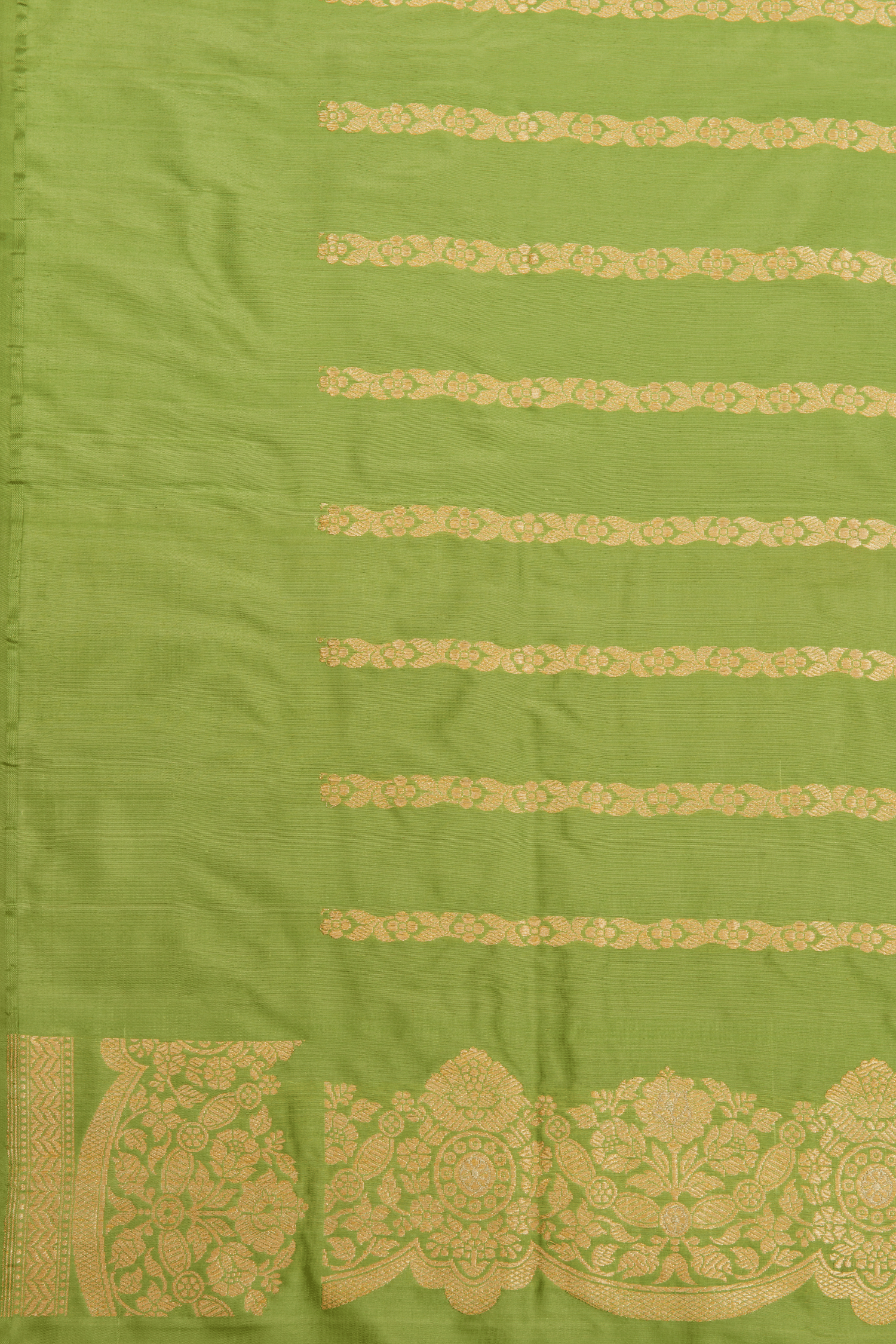 This stunning Banarasi silk saree in a soothing light green shade exudes timeless elegance and traditional allure. The saree is adorned with intricate golden zari weaving featuring classic floral and paisley motifs that reflect the rich heritage of Banaras craftsmanship.