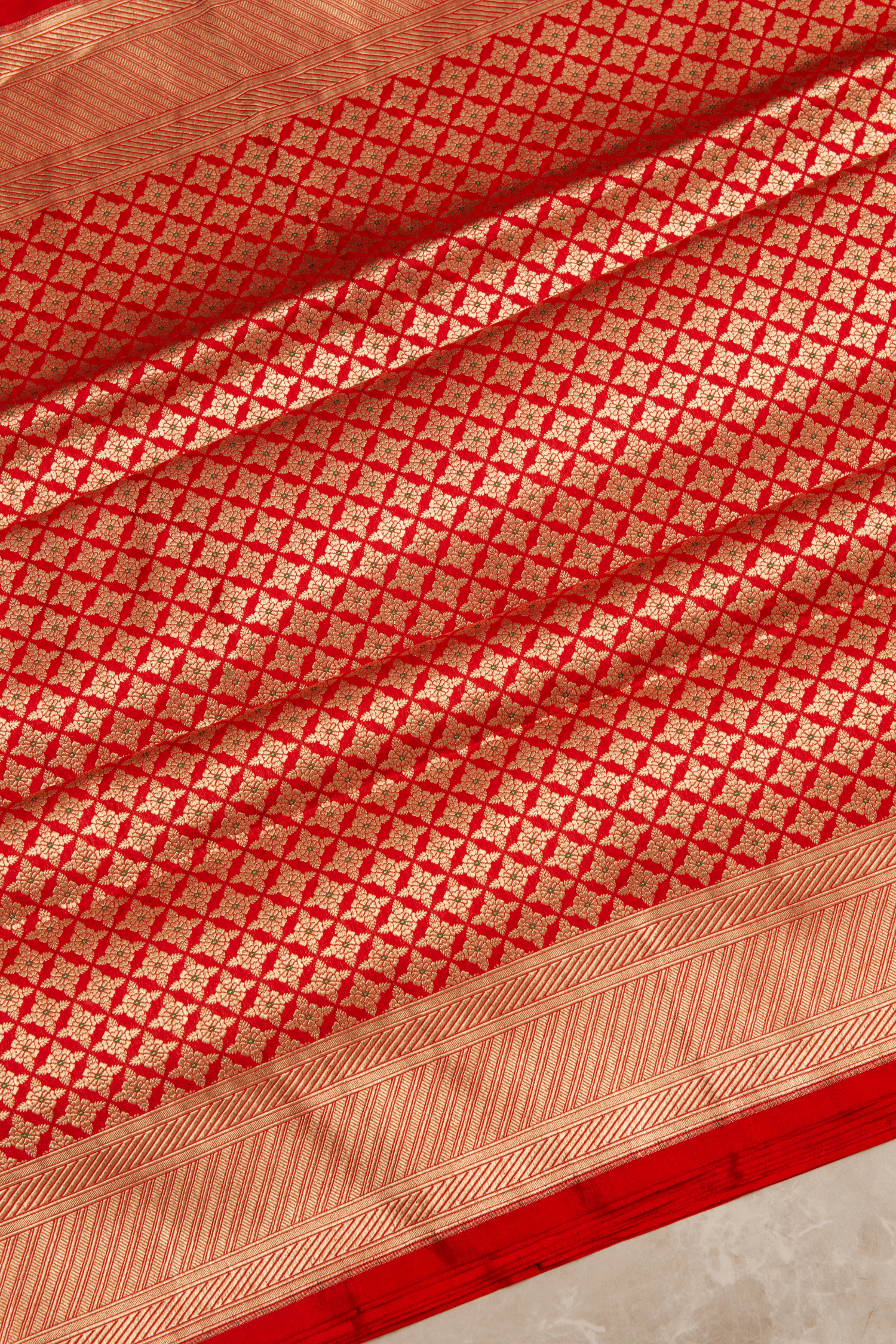 This Banarasi saree features a striking bright red base intricately woven with golden zari in a detailed diamond-shaped lattice pattern across the body with a touch of green color in the floral butta pattern.