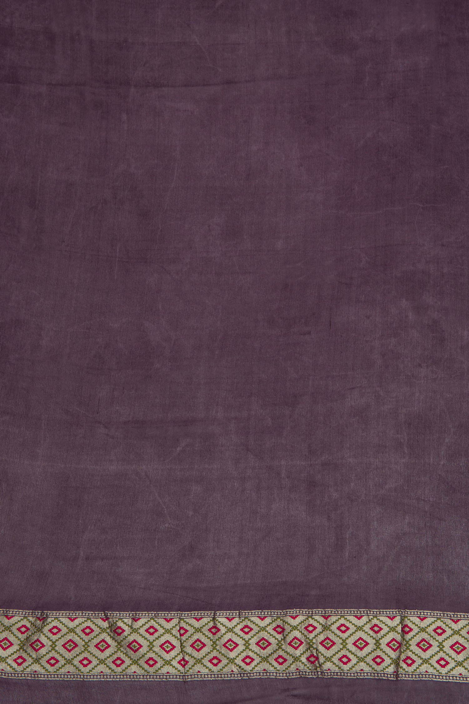 The blouse is a plain piece with matching borders that mirror the saree’s design, completing the ensemble with a coordinated and elegant finish.