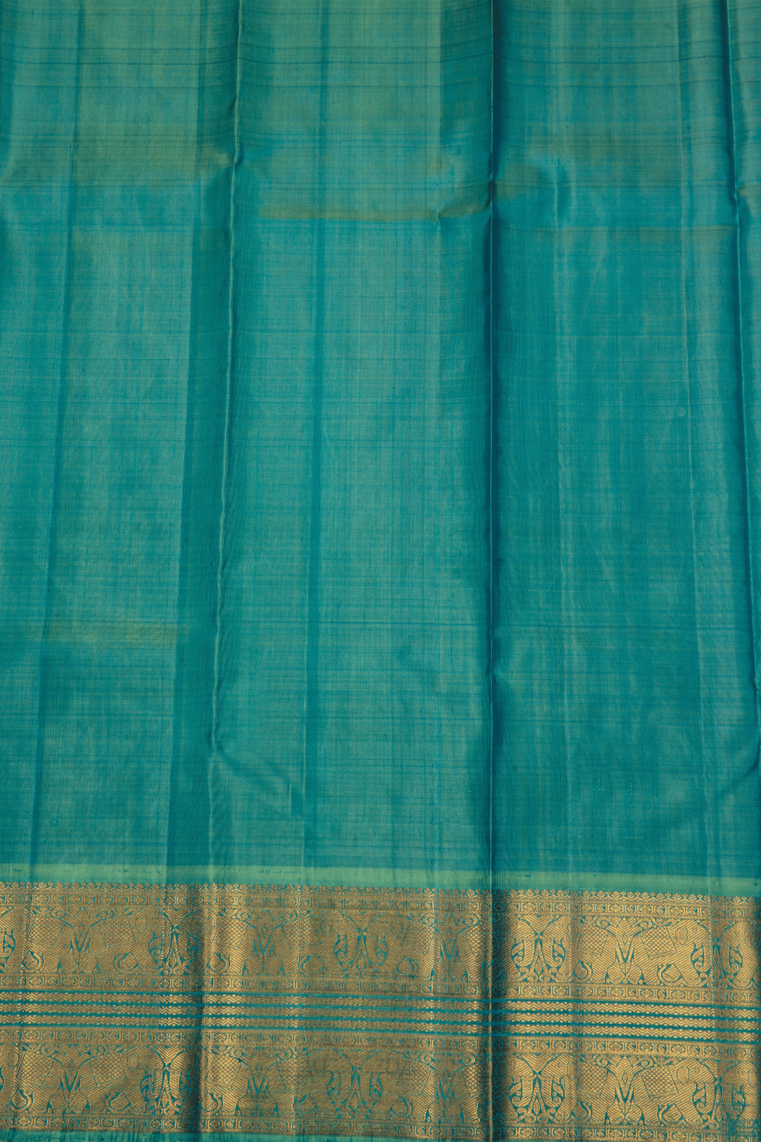 The saree is beautifully complemented by a rich turquoise blue border woven with detailed zari patterns, adding a regal contrast.