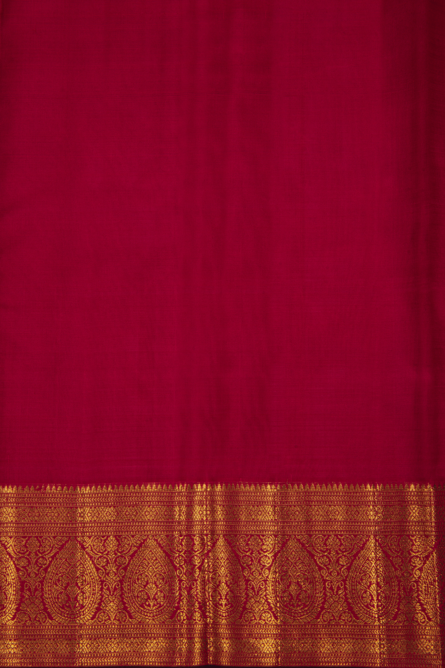 This exquisite Kanchipuram Pure Silk Saree in rich crimson red is adorned with intricate golden zari weaving that enhances its luxurious texture.