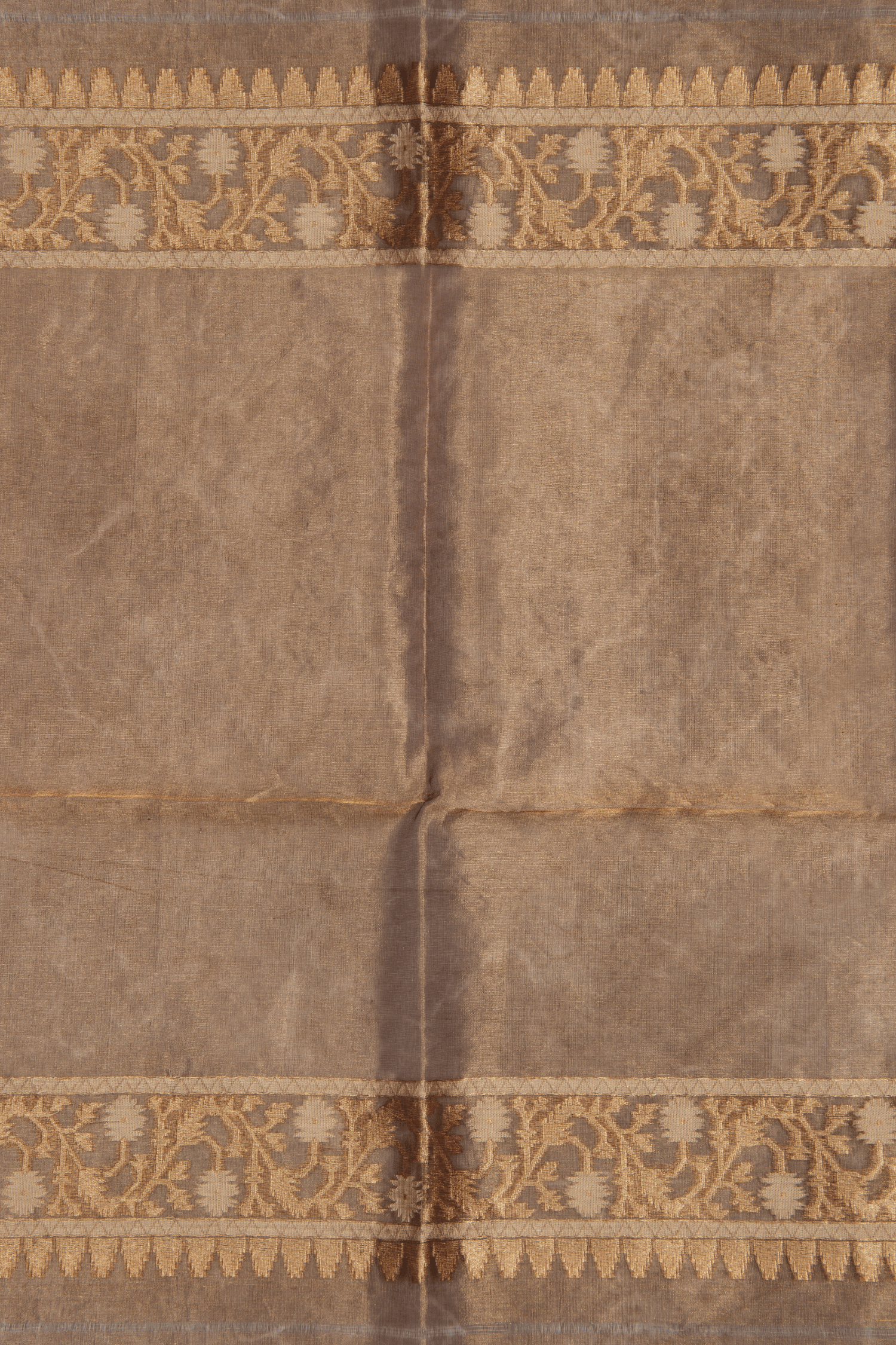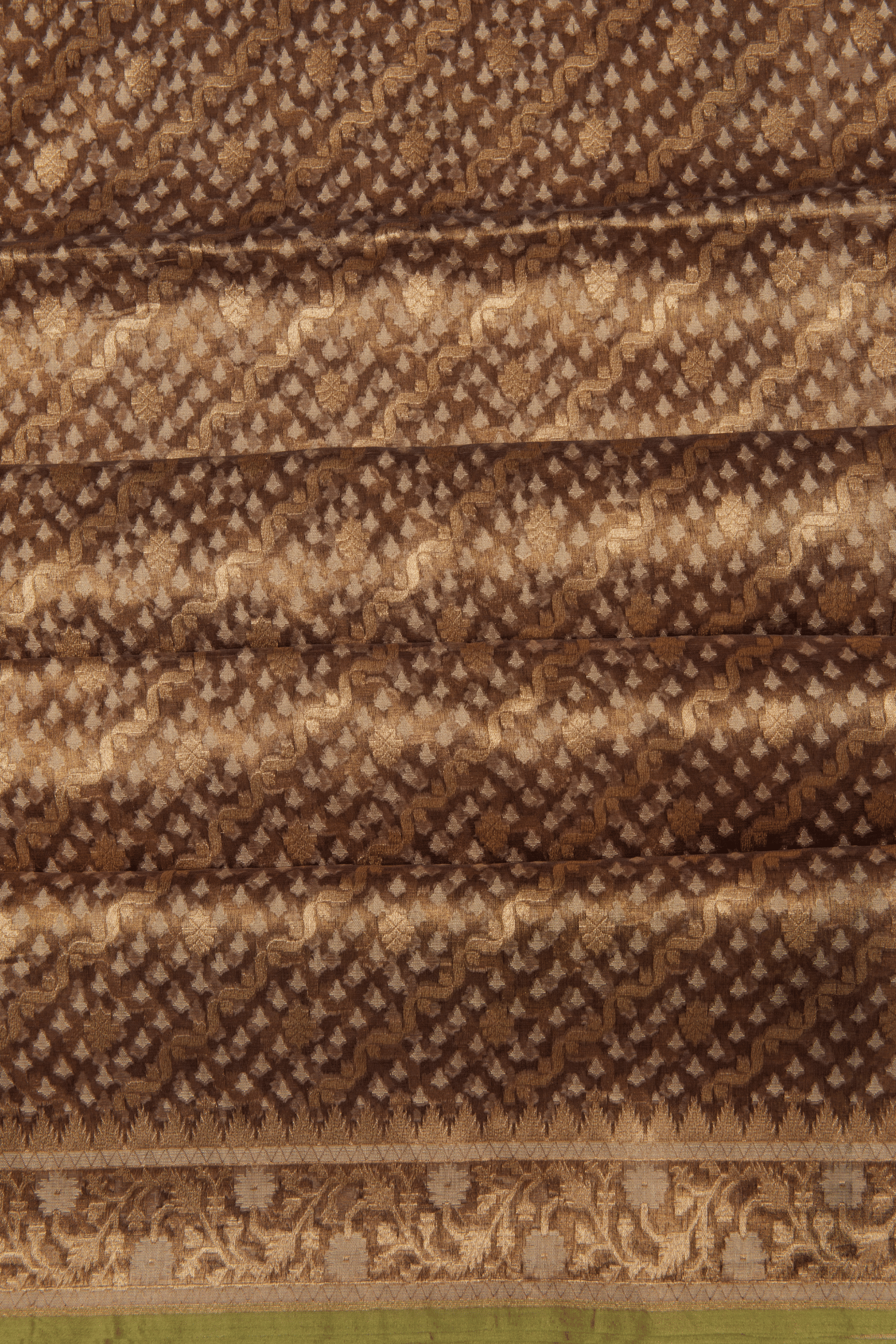 This elegant Kora Banarasi Silk Saree in a rich coffee brown hue is adorned with intricate golden zari weaving, featuring delicate floral and geometric patterns.