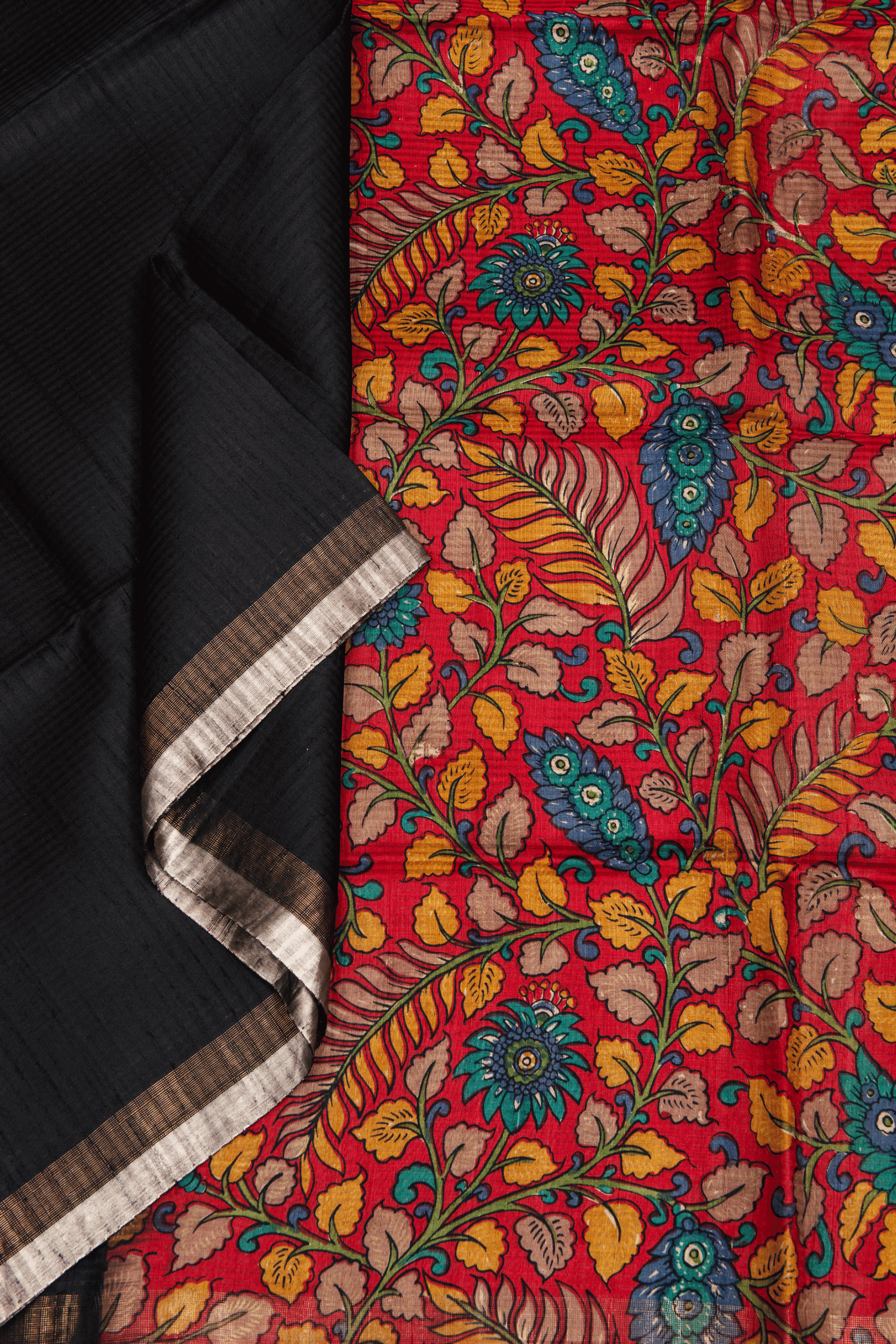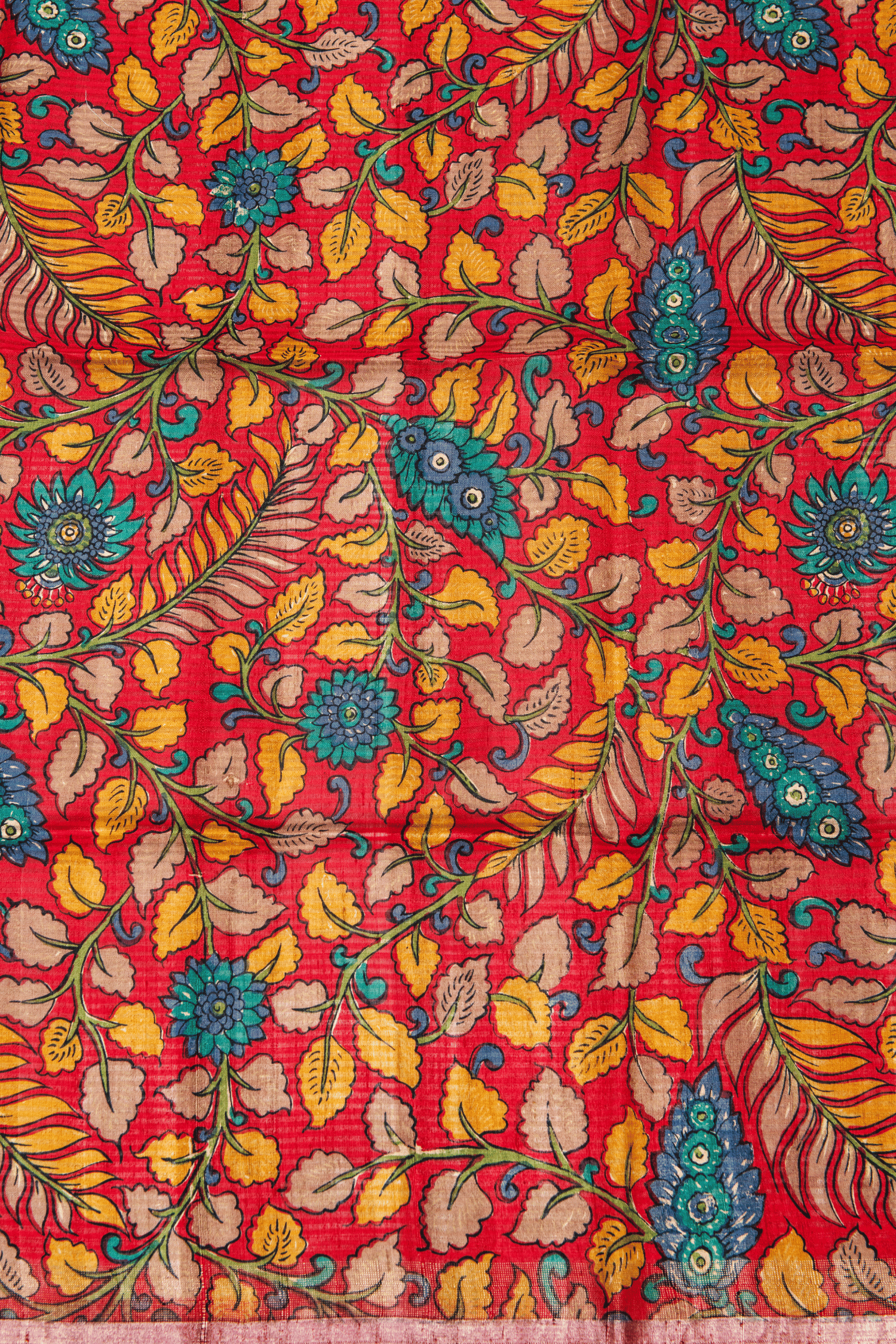 The pallu and blouse feature a vibrant contrast in red, adorned with intricate all-over kalamkari prints that add a touch of artistry and elegance.