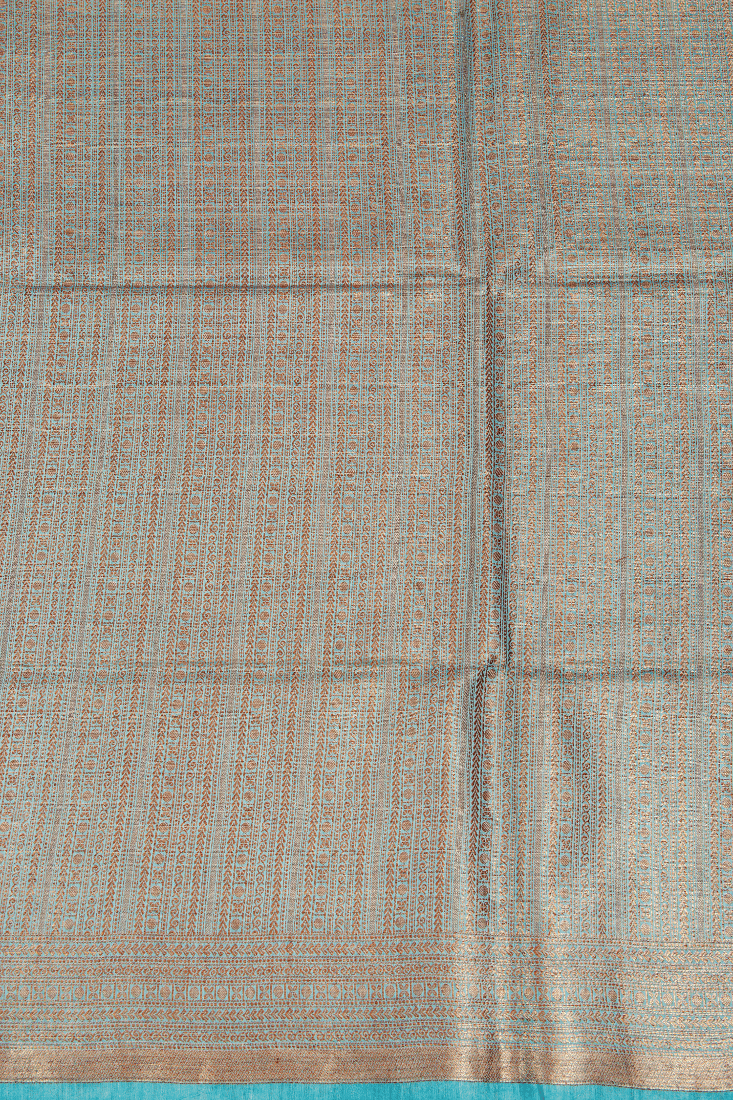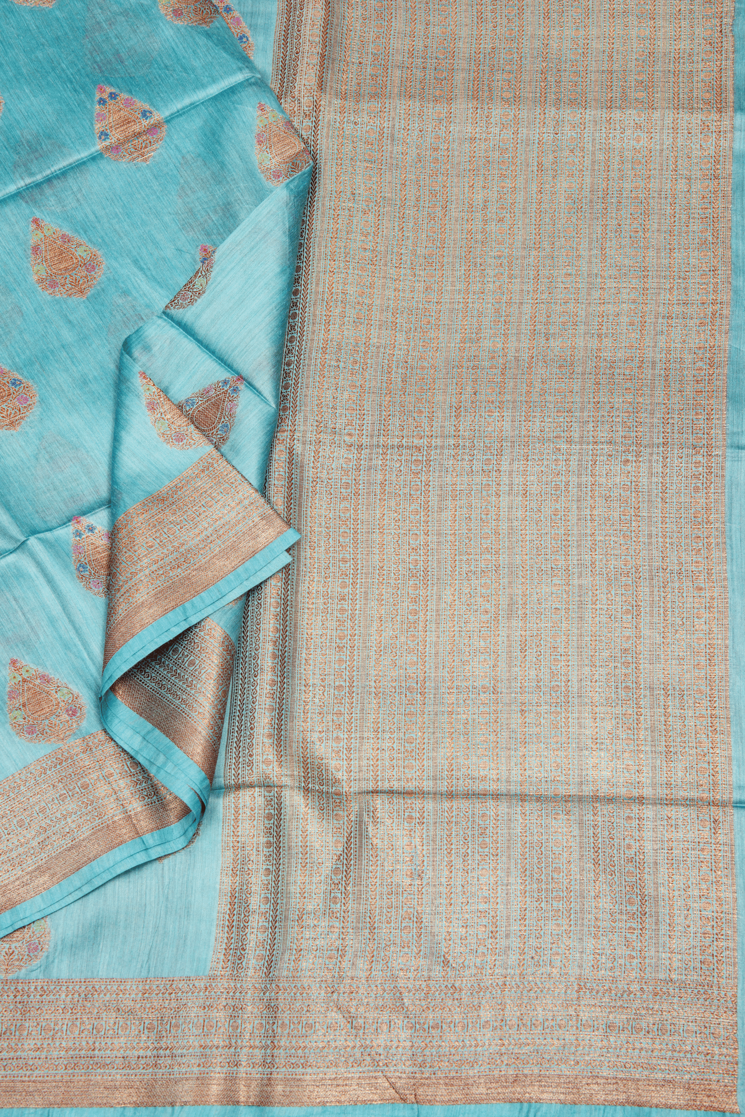 The Tussar blue saree is adorned with all-over gold zari buttas, creating a rich, textured look. The border features contrast gold zari stripes with a geometric pattern,