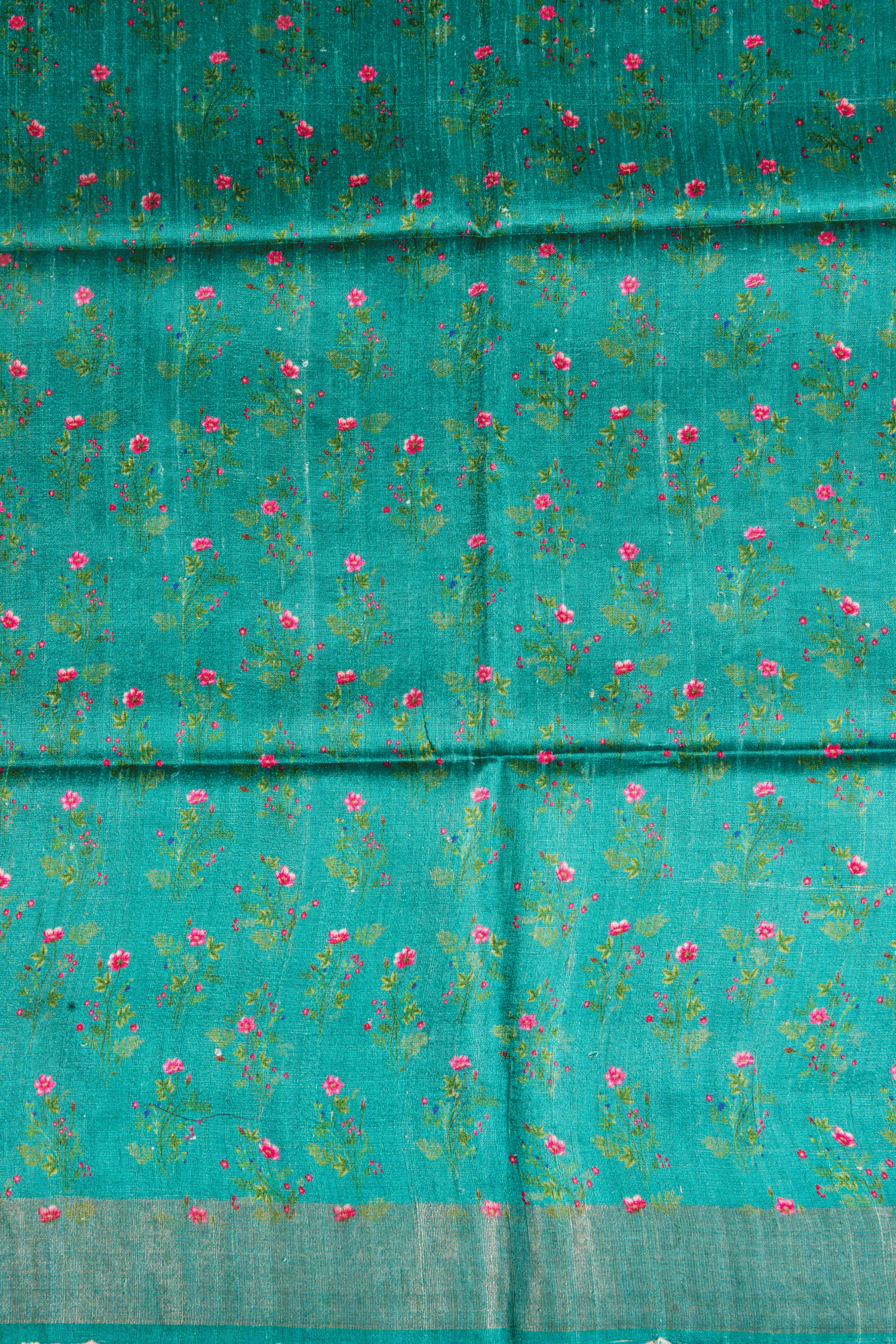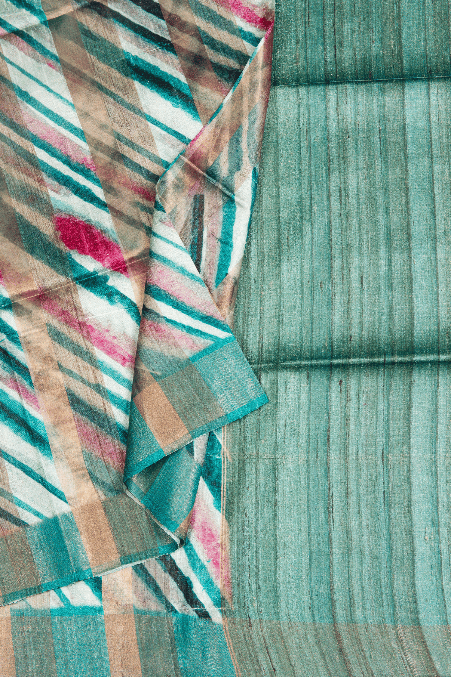 Add a touch of elegance to your wardrobe with our Tussar Printed multicolor green and white stripes saree.