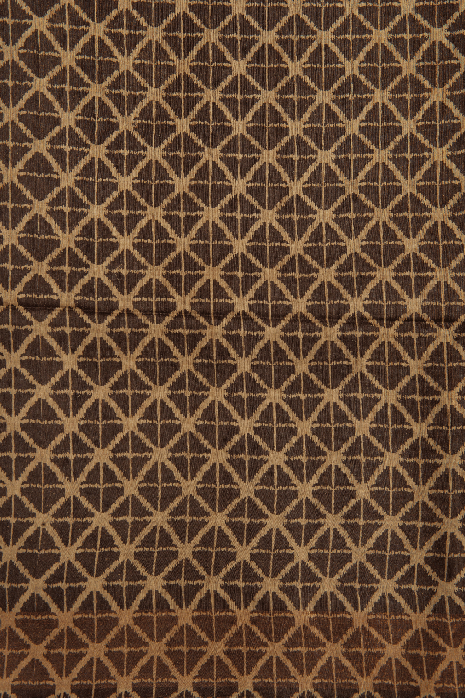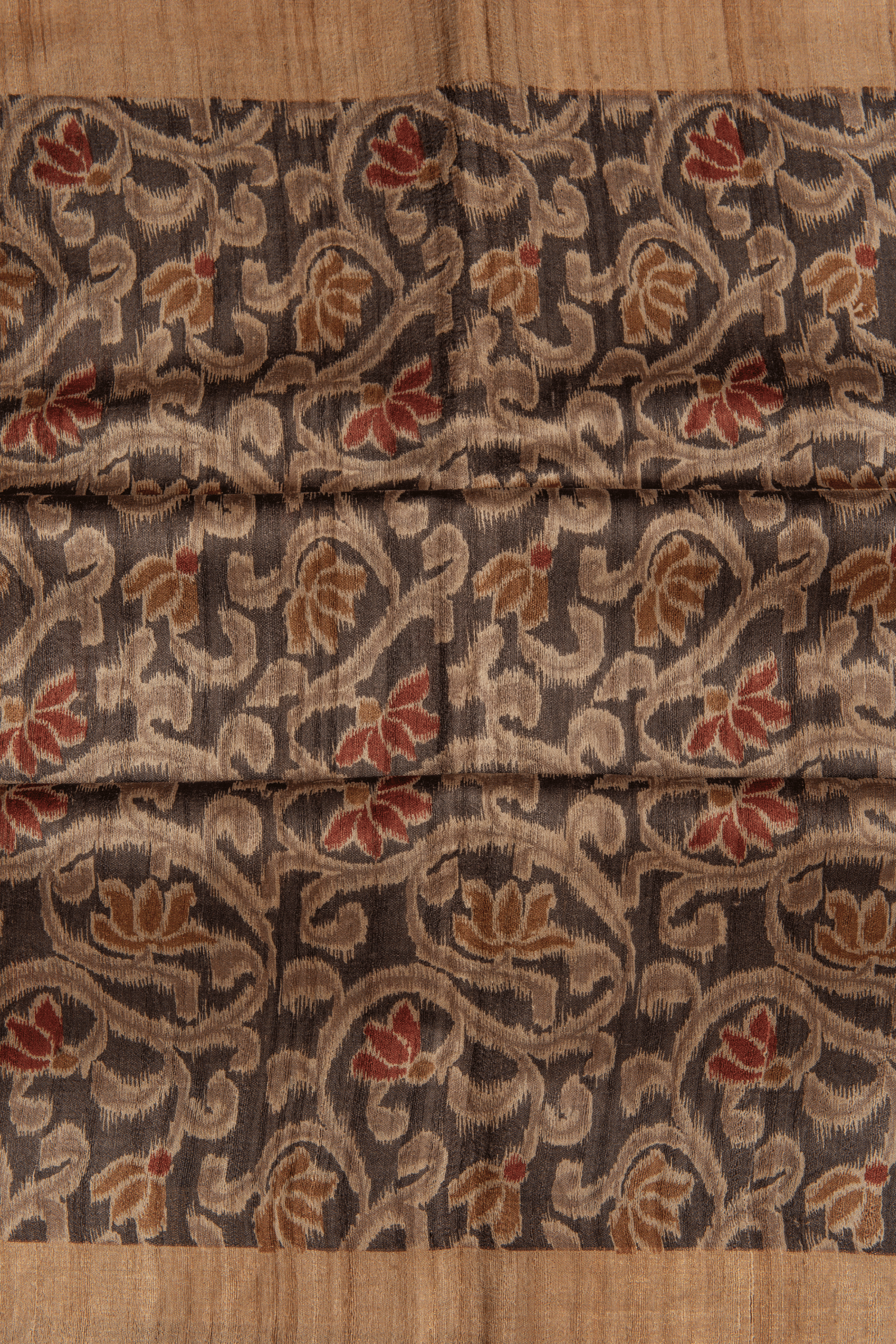 This elegant Tussar saree features a beige base adorned with intricate floral and vine motifs in brown and rust tones, creating a rich and traditional aesthetic.